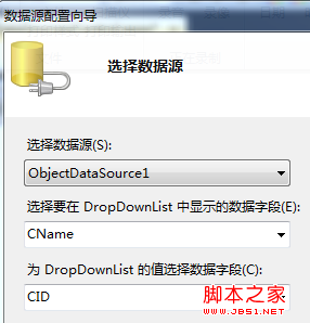 6、界面中拖入DropDownList數(shù)據(jù)控件 同樣點(diǎn)擊右上角=》選擇數(shù)據(jù)源為上述ObjectDataSources1