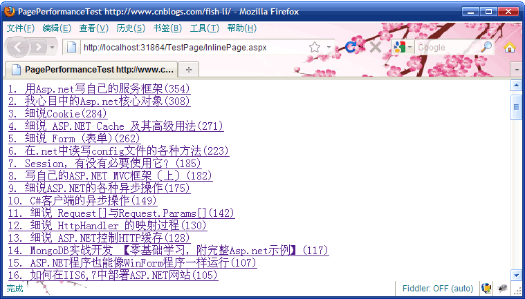 這個頁面其實就是顯示了一堆超鏈接,它們來自于我的博客側邊欄的【推薦排行榜】,總共有20條記錄,我讓頁面重復5次輸出,也就是生成了100個超鏈接。