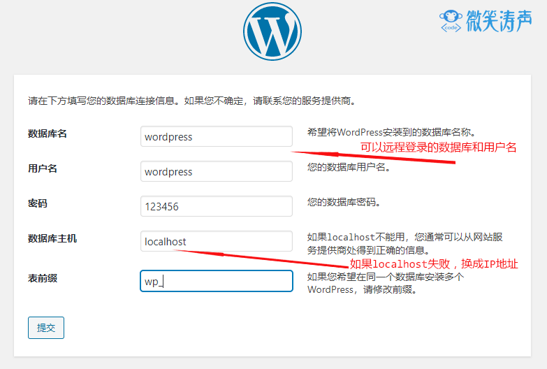 4、根據(jù)提示輸入相對(duì)于的信息。注意:數(shù)據(jù)庫(kù)用戶填寫可以遠(yuǎn)程訪問(wèn)的。數(shù)據(jù)庫(kù)主機(jī)建議填寫IP地址。點(diǎn)擊提交。如果提交以后出現(xiàn)錯(cuò)誤,根據(jù)提示操作即可。