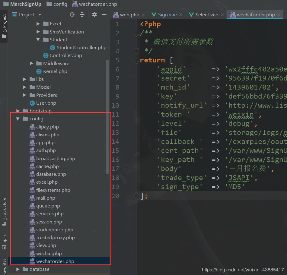 調(diào)用config(wechatorder.appid)。這樣我們就可以使用這個變量了。