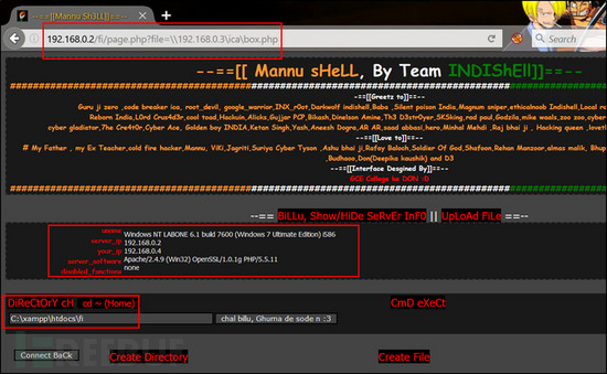 讓我們使用這個(gè)PHP shell SMB鏈接,以及易受攻擊的php代碼瀏覽它。