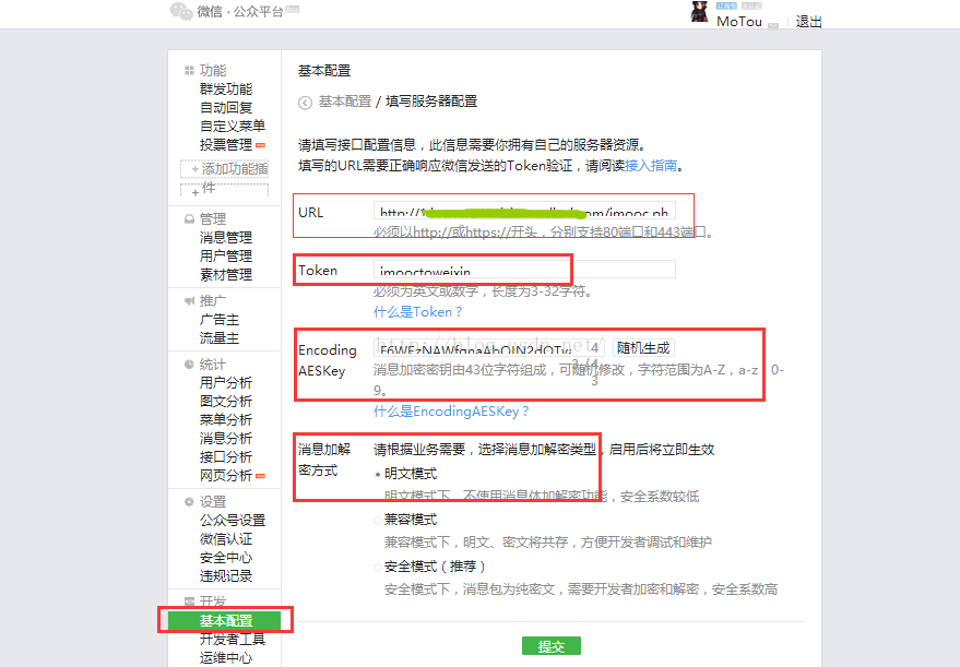需要注意的是,“接口配置信息”中,URL為驗(yàn)證 token 的回調(diào)地址,此URL填寫時(shí)多半需要你已經(jīng)將代碼上傳的外網(wǎng)可訪問的地址,我在后面會(huì)提供相應(yīng)代碼,再者注意Token值的確定,因?yàn)楹竺娲a中會(huì)用到