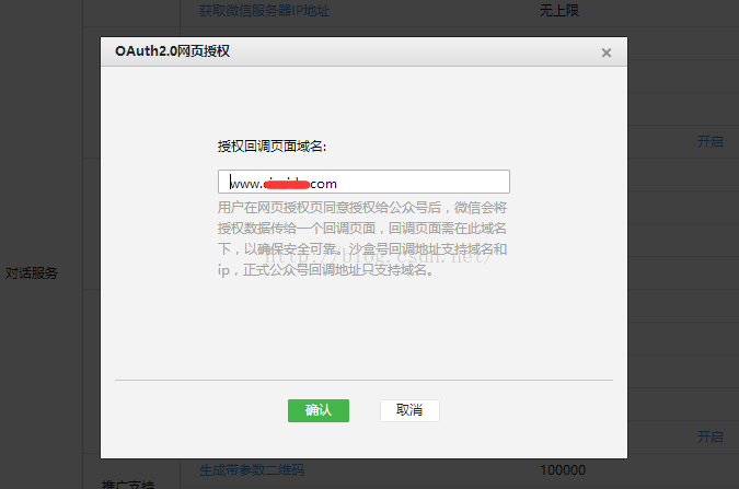 需要注意的是回調(diào)頁面的域名一定不要寫錯(cuò),之前我就是錯(cuò)在這里浪費(fèi)了很多時(shí)間,如果錯(cuò)誤,后面二維碼掃描時(shí)會(huì)報(bào)錯(cuò):“redirect_uri參數(shù)錯(cuò)誤”.個(gè)人建議去掉“http://”以及多余的后綴就好,可以參考下圖