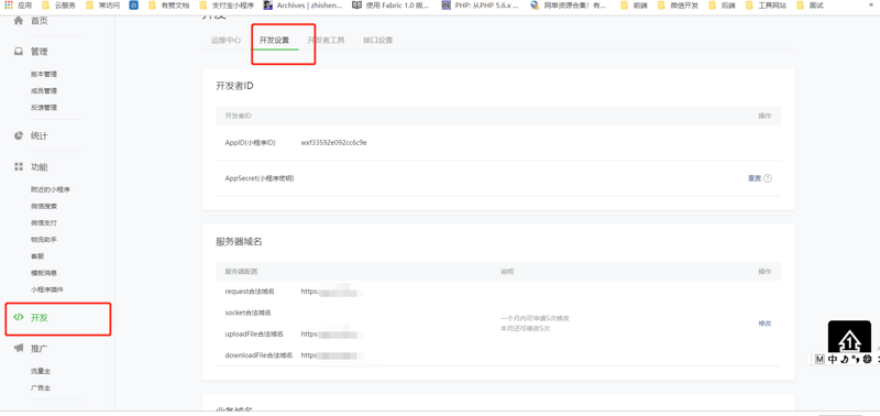 4.在小程序后臺配置好相應(yīng)的后端請求地址,路徑是:開發(fā)---->開發(fā)設(shè)置,如圖