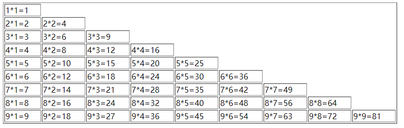 ?php echo "table width = 800 height = 200 border = 1>"; //輸出邊框 for($i=1;$i=9;$i++) //控制每行 { echo "tr>"; //輸出一行 for($j=1;$j=$i;$j++) //控制每列 { echo "td>"; //輸出一列 echo $i.'*'.$j.'='.$i*$j; echo "/td>"; } echo "/tr>"; } echo "/table>"; ?>