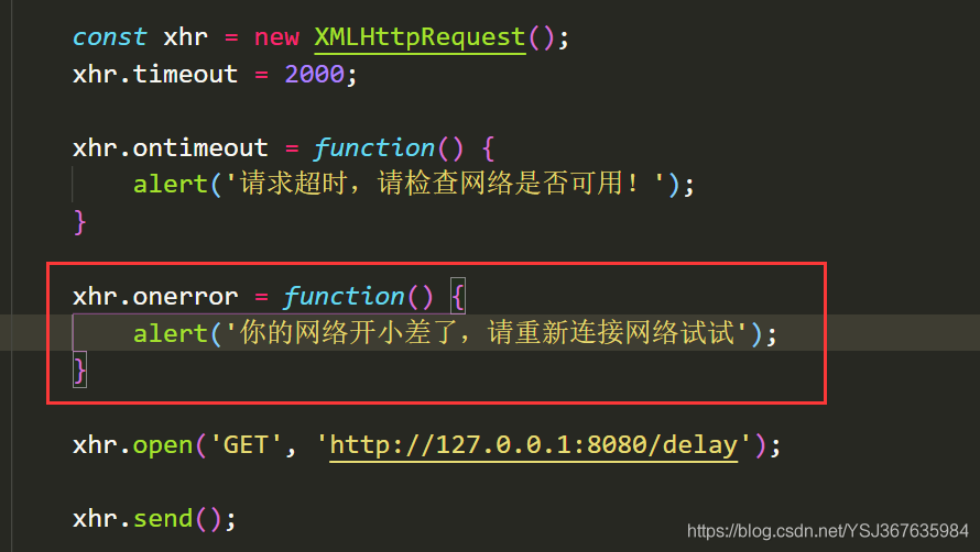 現(xiàn)在來看看網(wǎng)絡(luò)異常我們需要怎么處理,那么網(wǎng)絡(luò)異常在前端js里面也是有回調(diào)函數(shù)的,如下