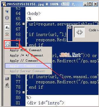 多行注釋呢?其實ASP里不支持多行注釋,比如/**/等肯定無法實現(xiàn)。也有一種間接的方法,那就是將ASP代碼作為HTML代碼一樣的注釋,很明顯這是很沒安全的做法,因為會直接暴露源代碼。 借助Dreamweaver8,可以方便地實現(xiàn)對ASP腳本代碼的批量多行注釋,該功能能夠?qū)崿F(xiàn)直接在選定的每一行前加上單引號,也可以方便地取消這些注釋。