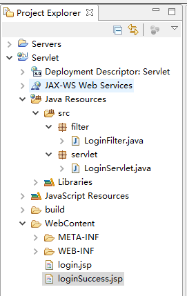 1.新建一個Dynamic Web Project項(xiàng)目,里面新建1個filter文件、1個servlet文件和2個jsp文件,整體的框架如圖所示: