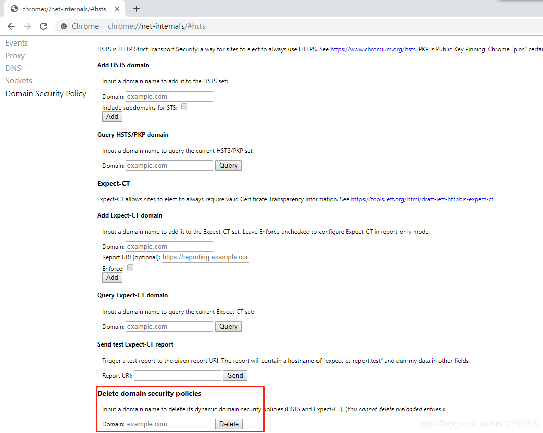 在chrome瀏覽器地址輸入:chrome://net-internals/#hsts