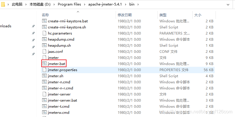 我們將上一步中的壓縮包進行解壓,進入到下圖所示文件目錄,雙擊jmeter.bat即可,如下圖所示: