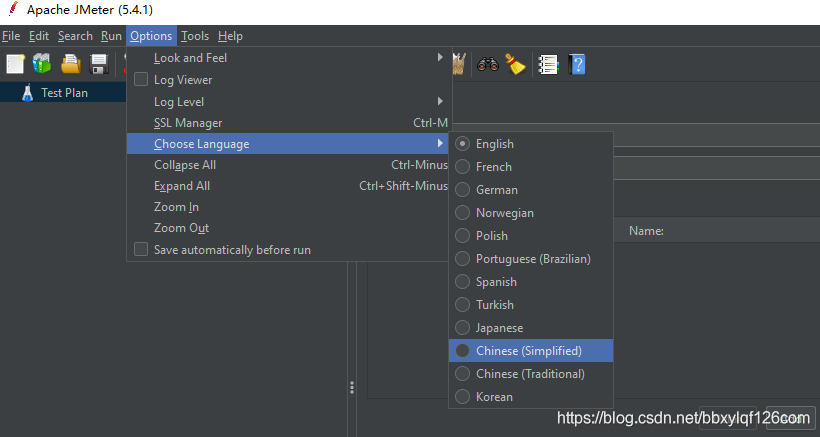 JMeter支持簡體中文操作,我們在工具欄選擇Options->Choose Language->Chinese(Simplified),