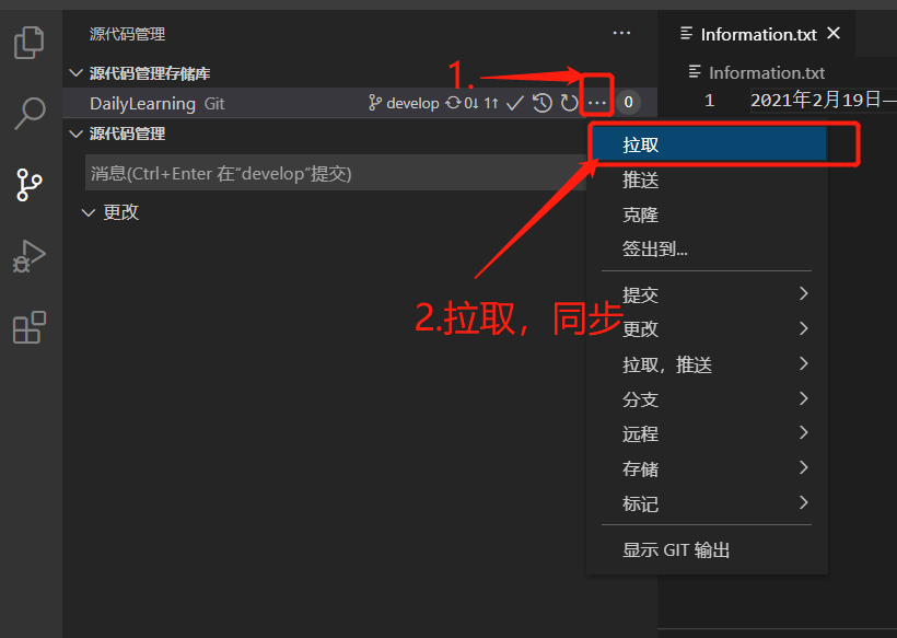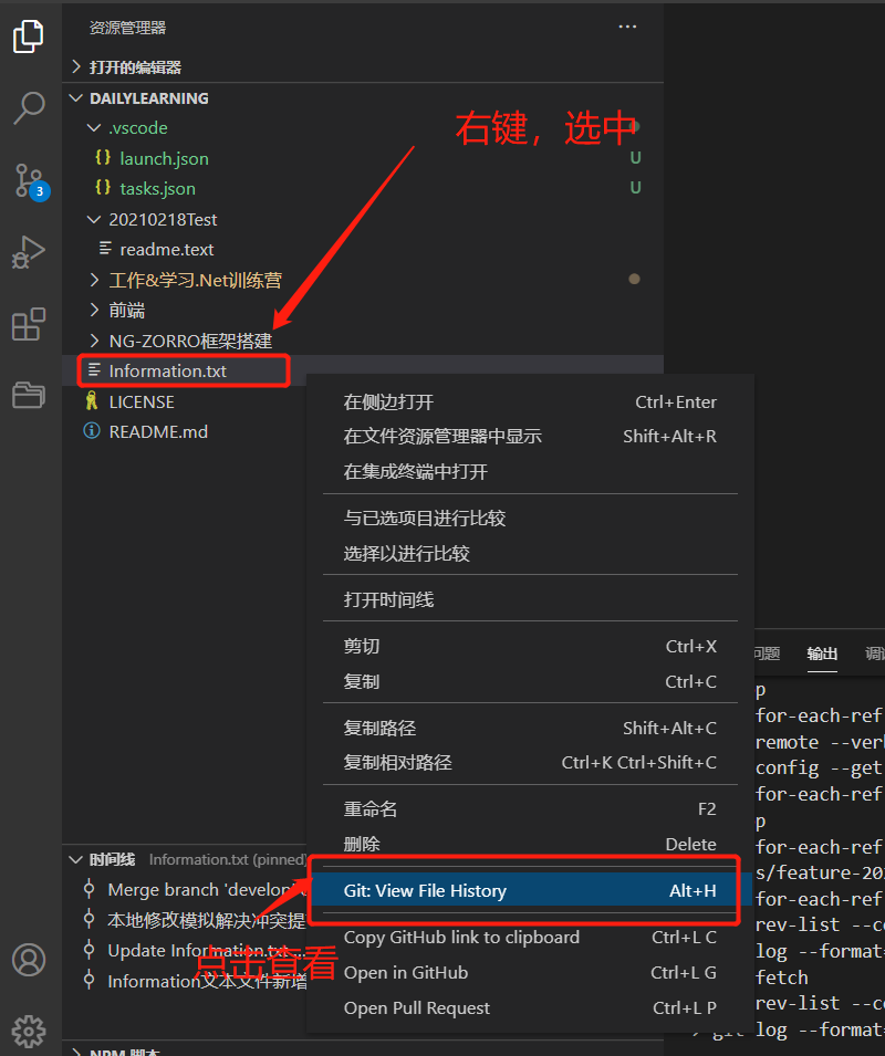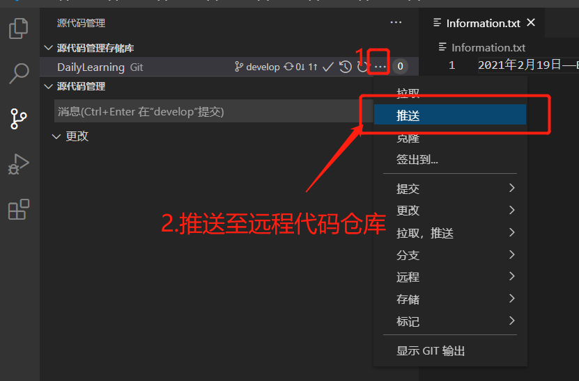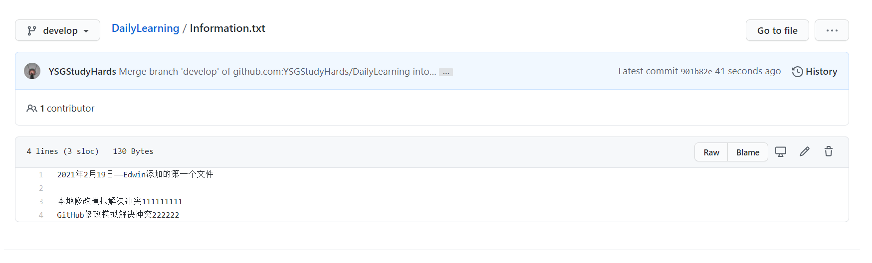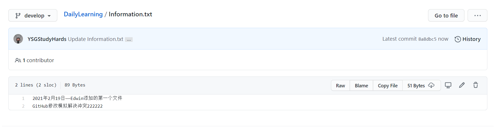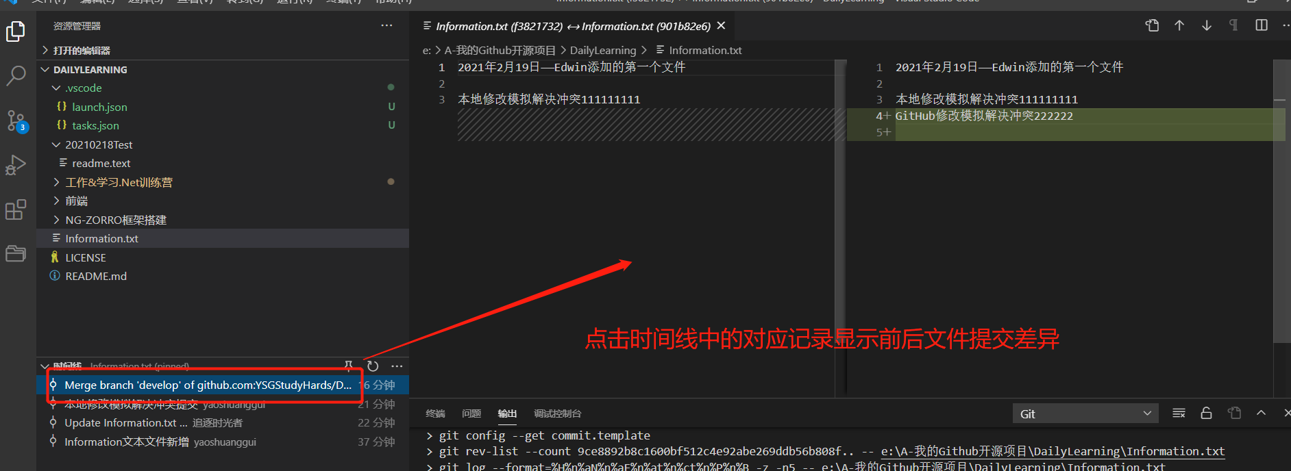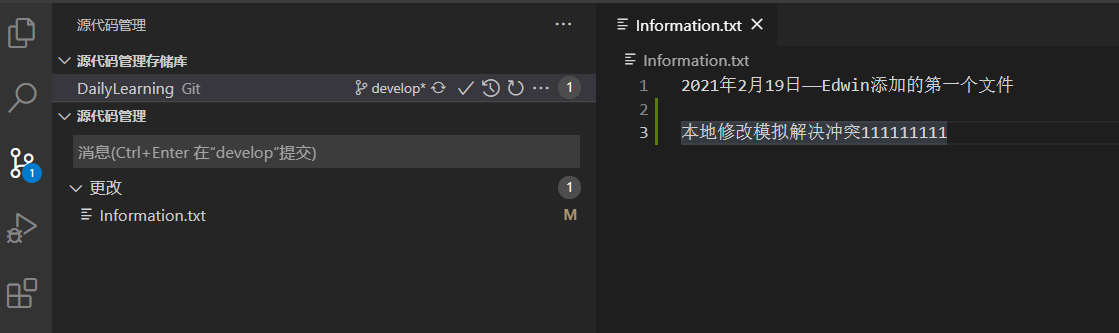 接下來我們來自己模擬一下多人開發(fā),如:我在本地修改Information.txt文本文件的內(nèi)容,然后在到GitHub中修改一次這樣本地在提交的時候就會產(chǎn)生沖突,然后我們可以借助VS Code智能的解決沖突的方式幫助我們來解決沖突。