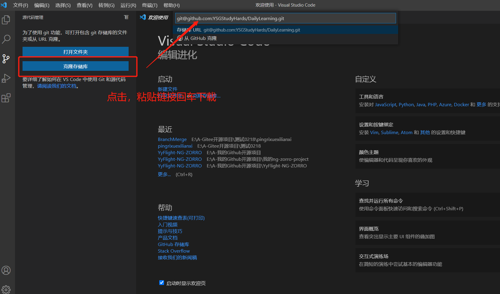 2、打開VS Code點擊克隆,粘貼SSH鏈接地址進行下載: