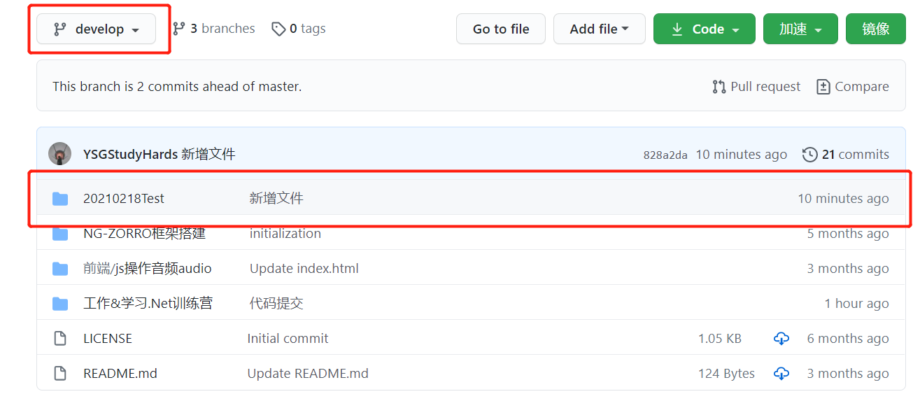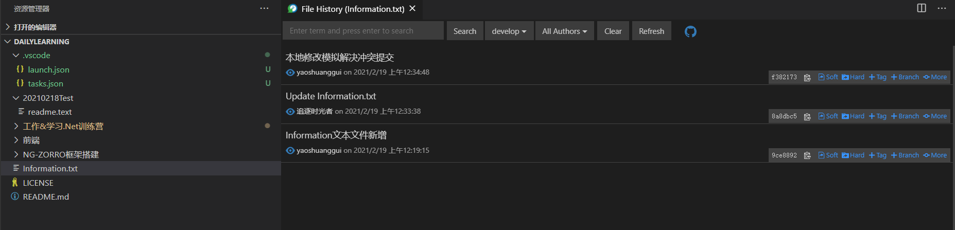 首先我們在feature-20210218子分支中創(chuàng)建一個文件夾和一個文本文件,然后將feature-20210218子分支合并到develop開發(fā)分支中合并提交到遠程代碼庫。