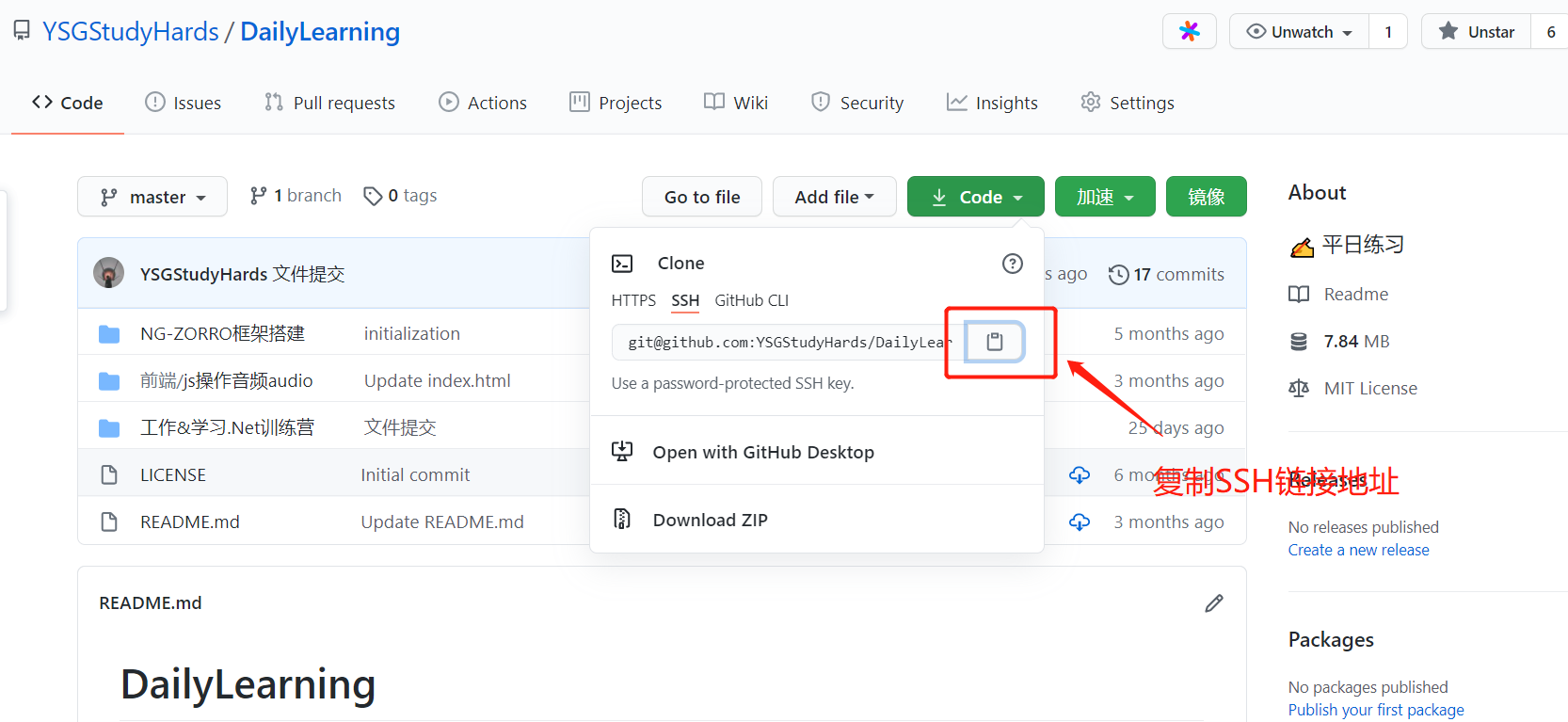 1、復制GitHub存儲庫的SSH鏈接地址: