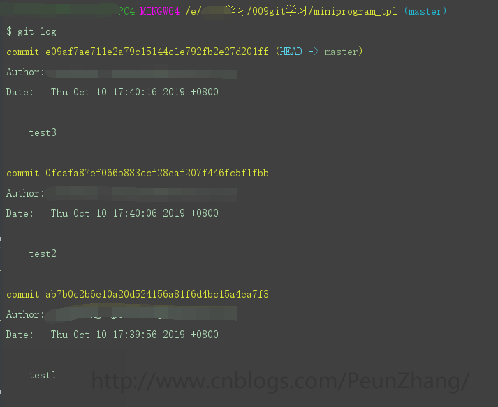 輸入git log,我們可以看到最近的3次提交,最近一次提交是test3,最早的一次是test1,其中一大串黃色的字母是commit id(版本號)