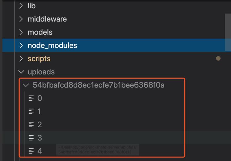 后臺接收到上傳請求后,首先查看名稱為文件 MD5 的文件夾是否存在,不存在則創(chuàng)建文件夾,然后通過 fs-extra 的 rename 方法,將切片從臨時路徑移動切片文件夾中,結(jié)果如下: