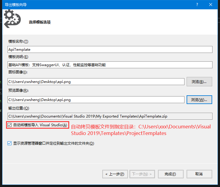 【自動(dòng)將模板導(dǎo)入 Visual Studio】選項(xiàng),選中后會(huì)將項(xiàng)目模板復(fù)制一份,放入到特定的文件夾中,下次建立新項(xiàng)目就可以搜索使用。