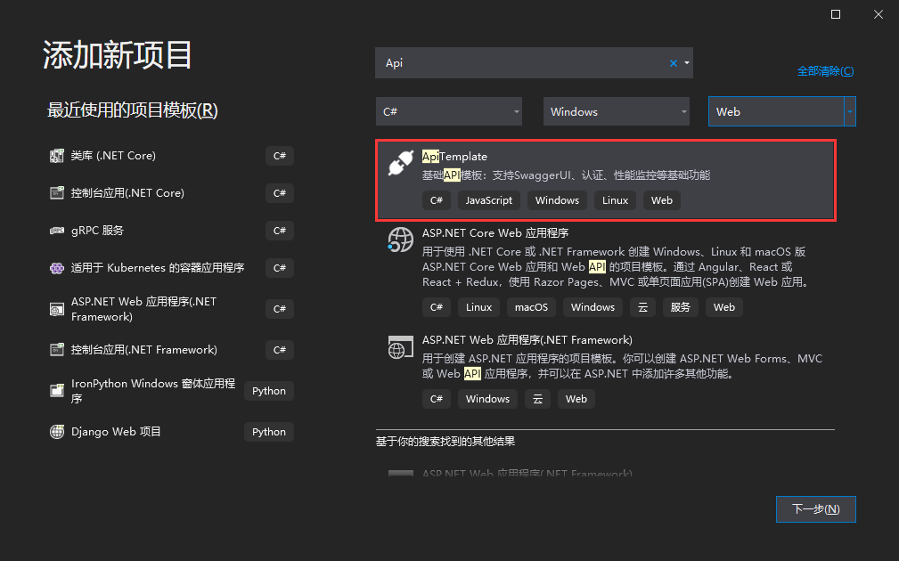 打開(kāi)vs進(jìn)入項(xiàng)目創(chuàng)建界面,搜索API,如下: