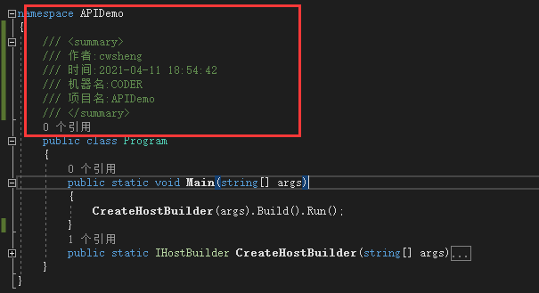 到此項(xiàng)目設(shè)置的標(biāo)簽以及代碼中命名空間、注釋都已生效。項(xiàng)目模板效果已實(shí)現(xiàn)