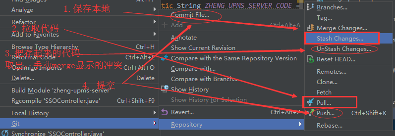 -> stash save(把自己的代碼隱藏存起來) -> 重新pull -> stash pop(把存起來的隱藏的代碼取回來 ) -> 代碼文件會顯示沖突 -> 右鍵選擇edit conficts,解決后點擊編輯頁面的 mark as resolved-> commitpush