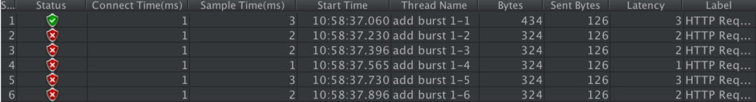 我們使用單 IP 在 10ms 內(nèi)發(fā)并發(fā)送了 6 個請求的執(zhí)行結(jié)果如下: