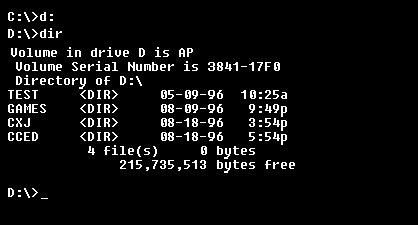如果我們要更換當(dāng)前目錄到硬盤(pán)的其它分區(qū)該怎么辦呢?當(dāng)然不是使用CD,否則我就不用說(shuō)了,這時(shí)應(yīng)該輸入盤(pán)符然后回車(chē)。比如要到D盤(pán),那么就輸入D:,然后回車(chē),瞧,現(xiàn)在提示符就變成D:\&;了。 再用dir命令,就是列出D盤(pán)的文件了。