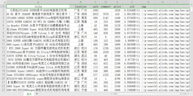 上面代碼爬取20也商品信息,并將其保存在本地的csv文件中,效果是這樣的: