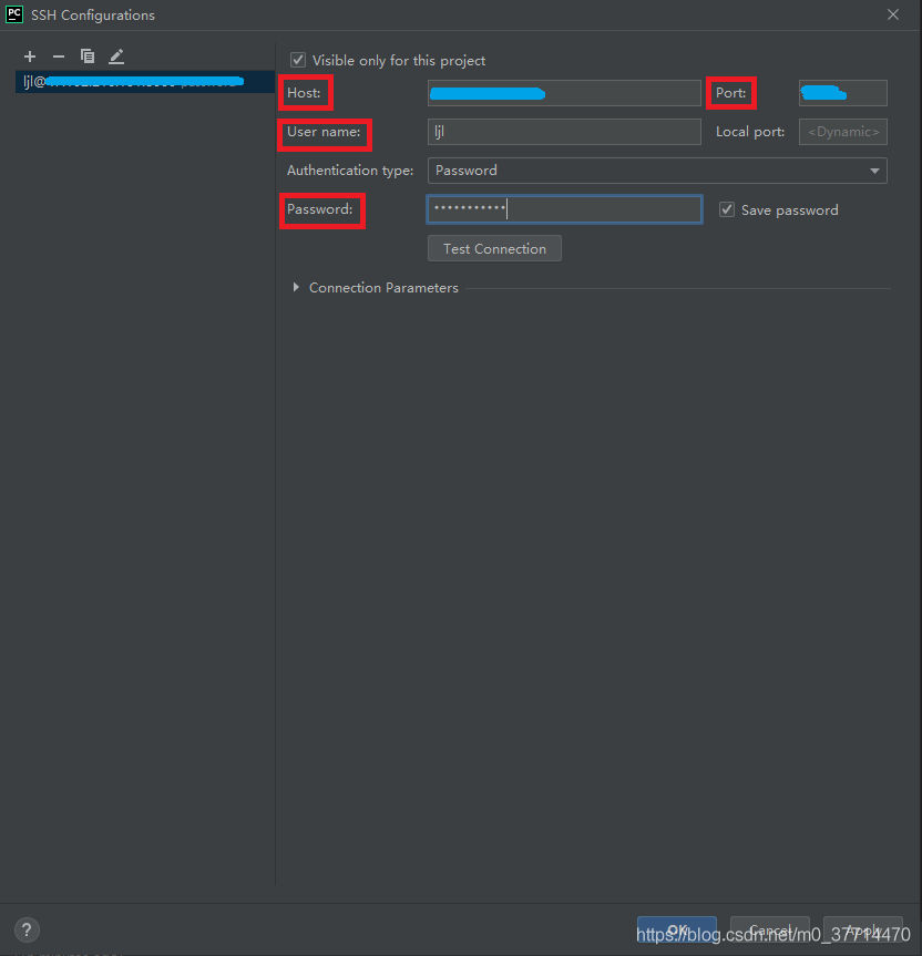 b. 在 “Connection” 選項卡下的 SSH configuration 選項填寫服務器鏈接的相關信息