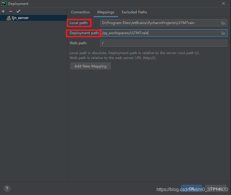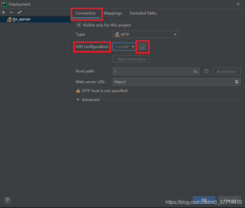 在 "Deployment" 窗口可以觀察到 “SSH configurations” 已經(jīng)填好,以后再配置其他項目時,可以直接選擇該 SSH configurations 即可;填寫 Root Path,這里就是想要在本地加載的服務器目錄的起始地址;Web server URL 暫時用不到,此處先不進行配置