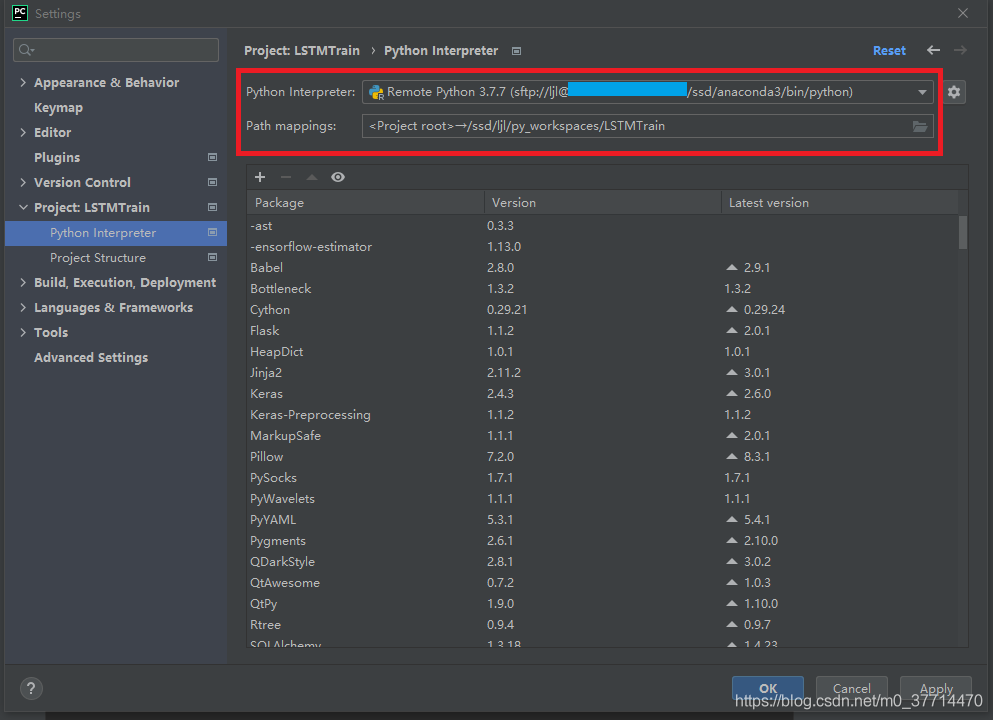 (5)當返回到 “Python Interpreter” 窗口時,發(fā)現(xiàn) Python Interpreter 已經(jīng)變成服務器端開發(fā)環(huán)境,Path Mappings 也是我們想要的本地項目到服務器項目的映射。