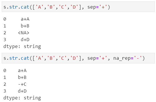 連接一個(gè)序列和另一個(gè)等長(zhǎng)的列表,默認(rèn)情況下如果有缺失值,則會(huì)導(dǎo)致結(jié)果中也有缺失值,不過可以通過指定缺失值na_rep的情況進(jìn)行處理
