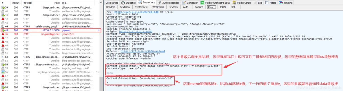上圖中第一個紅框中參數后面全是亂碼,這里就是我們上傳的文件二進制格式的表現,這里的數據就是通過files參數接收