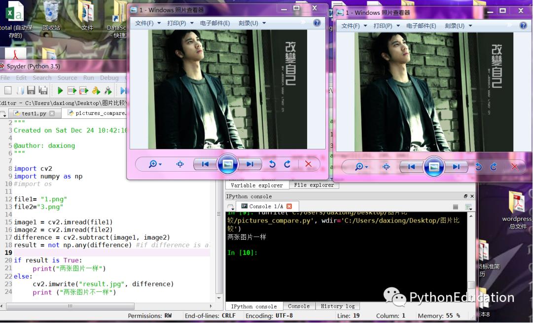 安裝好OpenCV后,我們測試一下兩張王力宏的照片是否一致。如果照片相同,程序會輸出兩張照片相同,如果兩張照片不同,程序會輸出兩張照片不同。腳本如下。