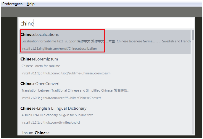 點擊Preferences —> 選擇Package Control:Install Package —> 輸入ChineseLocalizations