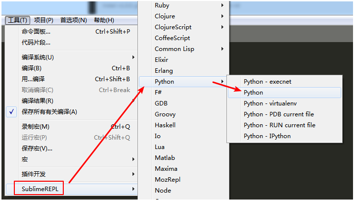 安裝完成后,[工具]菜單中會出現(xiàn)[SublimeREPL]工具: