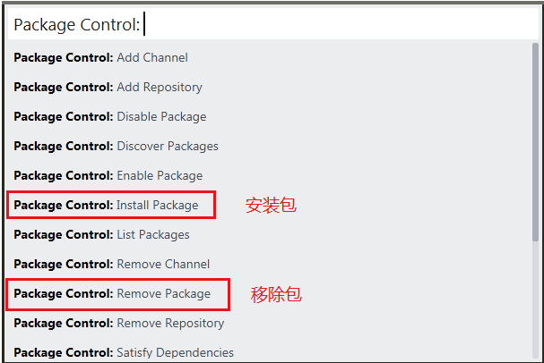 對于我們來說,Package Control插件常用的兩個功能就是安裝包和移除包。用的時候點擊Package Control:Install Package選項,搜索你需要安裝的包。或者點擊Package Control:Remove Package選項,選擇你要刪除的包進行卸載。