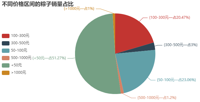 結(jié)論分析:這里,我故意把價(jià)格區(qū)間細(xì)分。這個(gè)餅圖也很符合實(shí)際,畢竟每年就過一次端午節(jié),還是以薄利多銷為主,接近80%的粽子,售價(jià)都在100元以下。當(dāng)然,還有一些中檔的粽子,價(jià)格在100-300元。大于300元,我覺得也沒有吃的必要,反正我是不會(huì)花這么多錢去買粽子。
