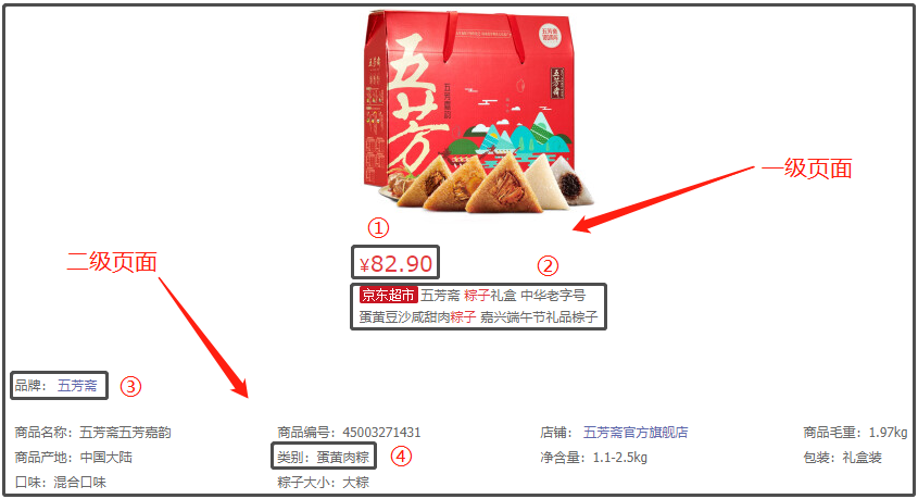 - 爬取說明: 基于京東網(wǎng)站,我們搜索網(wǎng)站“粽子”數(shù)據(jù),大概有100頁。我們爬取的字段,既有一級頁面的相關(guān)信息,還有二級頁面的部分信息;