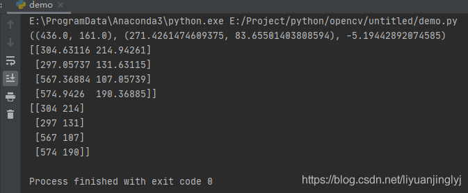 這里我們可以清楚的看到minAreaRect()函數(shù)返回值的轉(zhuǎn)換過程。先通過boxPoints()函數(shù)轉(zhuǎn)換為drawContours()函數(shù)能接受的參數(shù)格式,然后通過取整轉(zhuǎn)換為具體的像素坐標(biāo)值。