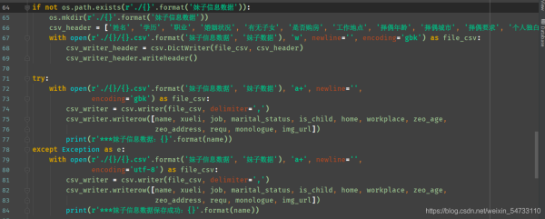 with open(r'./{}/{}.csv'.format('妹子信息數(shù)據(jù)', '妹子數(shù)據(jù)'), 'w', newline='', encoding='gbk') as file_csv: