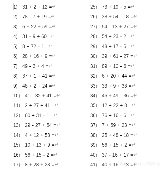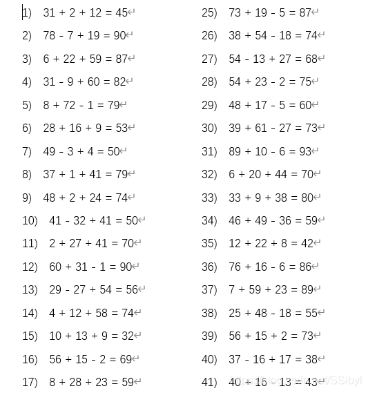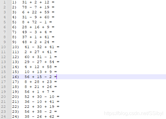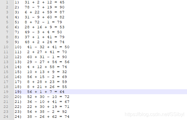 生成在[1,99]內(nèi)的隨機數(shù)x, y, z,若它們的計算結(jié)果在[0, 100]內(nèi),且算式中的任何兩位的計算也在[0, 100]內(nèi),就保存在字符串里,作為答案,如"10 + 13 + 9 = 32";將字符串存入set中,因為Python的set是無序且不重復(fù)的,所以它會自動打亂和去重;把答案寫入文件,寫入文件時要寫入index(題號)去掉結(jié)果再寫入另一個文件,作為題目
