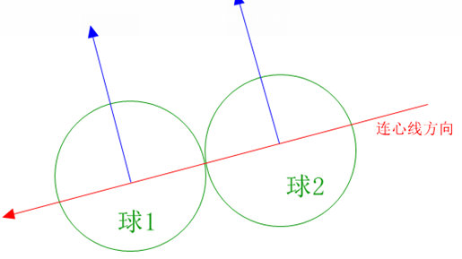 - 而連心線上是相互碰撞的(如下圖所示),會有作用力,所以我們只需要求出球1和球2的連心線方向上的速度值.