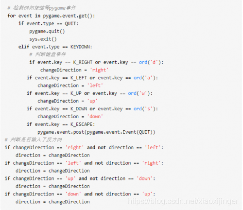 如何控制貪吃蛇的運動軌跡呢,那么就需要按鍵控制了。我們通過鍵盤的↑↓←→和WSAD來控制,如果想直接退出游戲,則可以通過Esc鍵。這里需要強調(diào)的是,貪吃蛇里面是不能反方向運動,因此,我們需要進一步的增加限制條件: