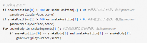 死亡判斷則分為兩類情況,一是觸碰到了游戲界面的邊界,二是貪吃蛇觸碰到了自己的身體。一旦發(fā)生死亡,則觸發(fā)gameover。