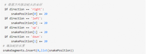 方向設(shè)置好了,那么貪吃蛇蛇身變換怎么做???很簡單,我們只需要根據(jù)方向變換一下坐標(biāo)即可。