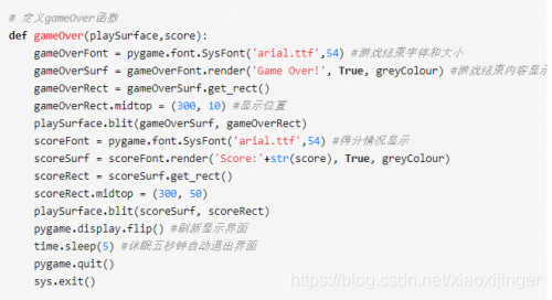 游戲結(jié)束界面,我們會顯示“Game Over!”和該局游戲所得分數(shù),相關(guān)代碼如下: