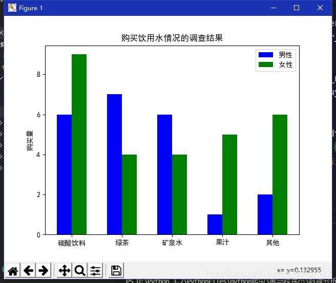 plt.title('購(gòu)買飲用水情況的調(diào)查結(jié)果') # 圖形標(biāo)題