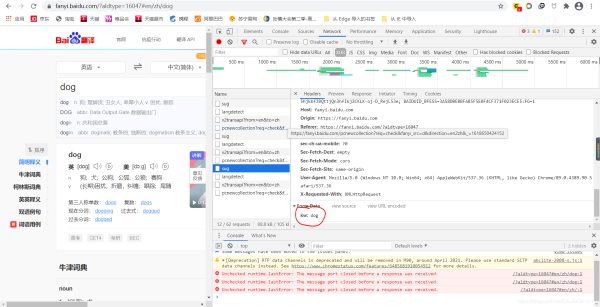 (注意:我們發(fā)現(xiàn)其中有三個 sug ,我選的只是其中一個。如果我們?nèi)紟c開看,就會發(fā)現(xiàn),他們的 kw 分別是:d 和 do。這是因為我打 dog 時一個單詞一個單詞打的,而 AJAX 是時時刷新。如果輸入中文就不會出現(xiàn)這種情況。翻譯中文時,我們找的也不是 sug 了,具體是什么,就看哪個包的 data 的值是我們要翻譯的詞。)