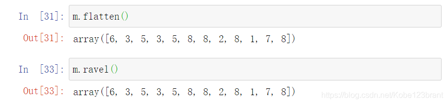 除此之外,還有一種比較常用的數(shù)組拉平方法, m.flatten()以及m.ravel(),這兩種方法類似